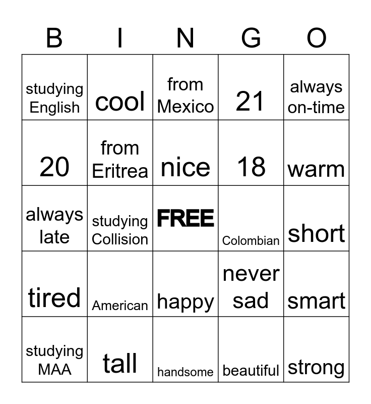 This bingo card has a free space and 29 words: studying MAA, studying CMA, studying Collision, studying HVAC, studying English, from Mexico, from Eritrea, American, Colombian, tall, short, strong, handsome, beautiful, warm, cold, happy, tired, always on-time, always late, never sad, 16, 18, 20, 21, cool, smart, nice and a good friend.