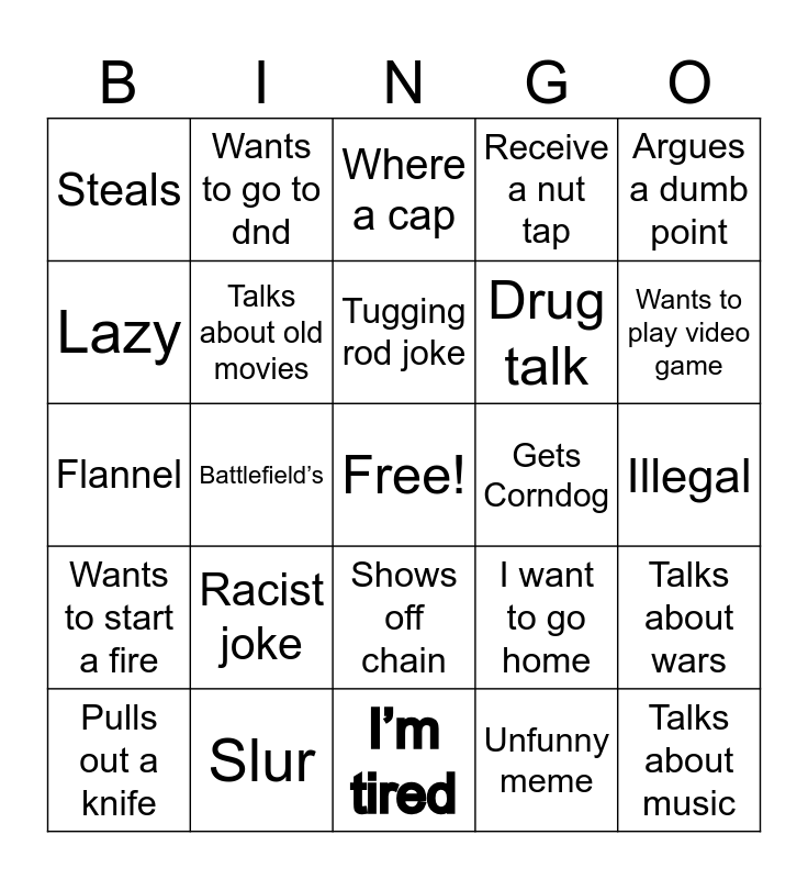 This bingo card has a free space and 24 words: Racist joke, Slur, Tugging rod joke, Pulls out a knife, Argues a dumb point, Steals, Lazy, Wants to go to dnd, Gets Corndog, Shows off chain, Drug talk, Flannel, I want to go home, Talks about wars, Talks about old movies, Unfunny meme, Illegal, Where a cap, Wants to play video game, Battlefield’s, Talks about music, Wants to start a fire, Receive a nut tap and I’m tired.