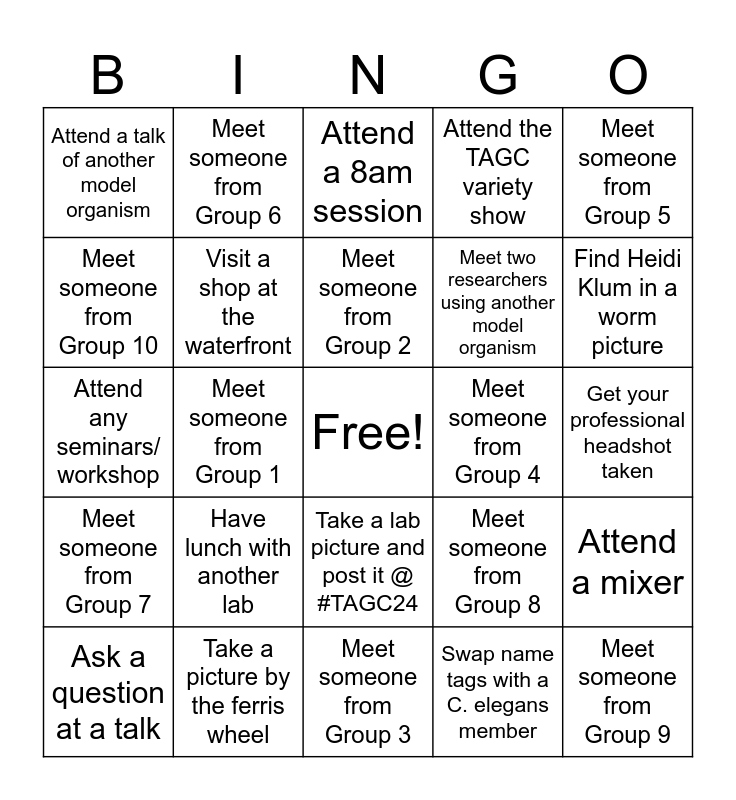 This bingo card has a free space and 27 words: Meet someone from Group 8, Visit 10 posters, Meet two researchers using another model organism, Meet someone from Group 3, Meet someone from Group 10, Attend a 8am session, Meet someone from Group 6, Meet someone from Group 7, Meet someone from Group 4, Attend a mixer, Attend any seminars/ workshop, Attend the TAGC variety show, Ask a question at a talk, Take a picture by the ferris wheel, Find Heidi Klum in a worm picture, Take a picture with The Awakening sculpture, Visit a shop at the waterfront, Meet someone from Group 2, Have lunch with another lab, Attend a talk of another model organism, Get your professional headshot taken, Swap name tags with a C. elegans member, Meet someone from Group 1, Meet someone from Group 9, Take a lab picture and post it @ #TAGC24, Meet someone from Group 5 and Meet someone with a C. elegans or TAGC T-shirt.