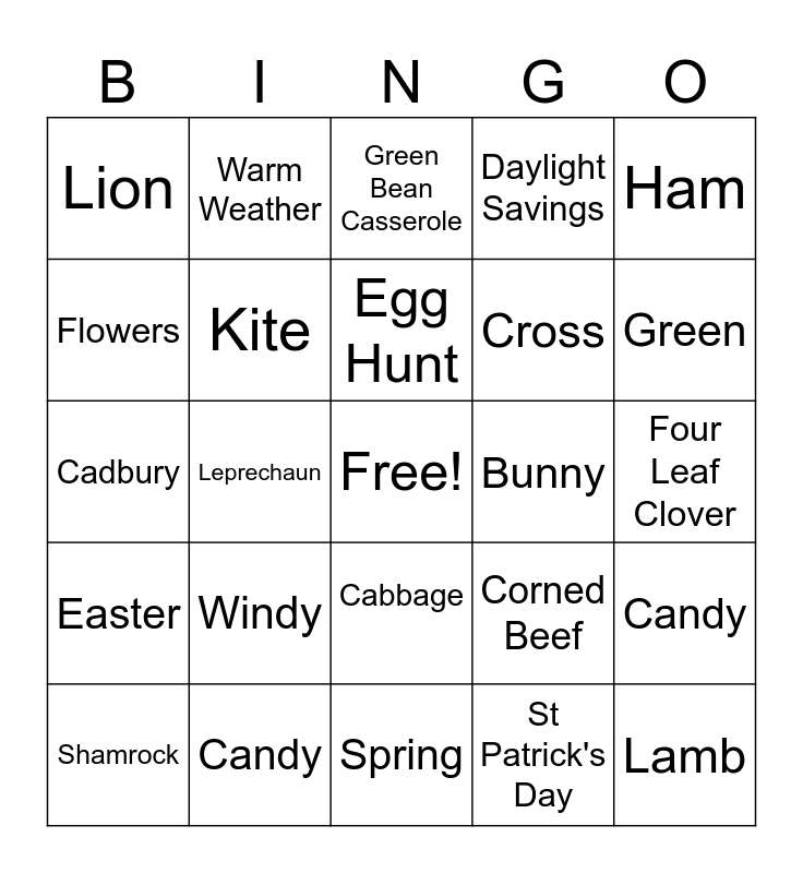 This bingo card has a free space and 24 words: Windy, Candy, Egg Hunt, Shamrock, Ham, Lion, Flowers, Warm Weather, Bunny, Cabbage, Cross, Cadbury, Corned Beef, Candy, Kite, St Patrick's Day, Four Leaf Clover, Green Bean Casserole, Green, Leprechaun, Lamb, Easter, Daylight Savings and Spring.