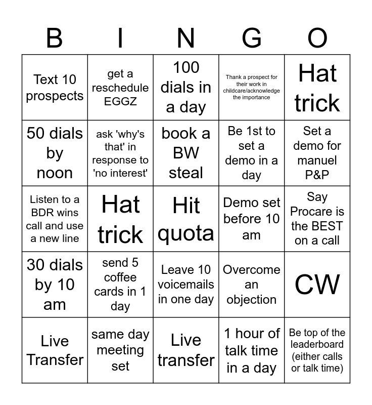 This bingo card has a free space and 24 words: send 5 coffee cards in 1 day, same day meeting set, book a BW steal, Live Transfer, Hat trick, Text 10 prospects, 50 dials by noon, get a reschedule EGGZ, Demo set before 10 am, Leave 10 voicemails in one day, Be 1st to set a demo in a day, Listen to a BDR wins call and use a new line, Overcome an objection, CW, ask 'why's that' in response to 'no interest', 1 hour of talk time in a day, Say Procare is the BEST on a call, 100 dials in a day, Set a demo for manuel P&P, Hat trick, Be top of the leaderboard (either calls or talk time), 30 dials by 10 am, Thank a prospect for their work in childcare/acknowledge the importance and Live transfer.