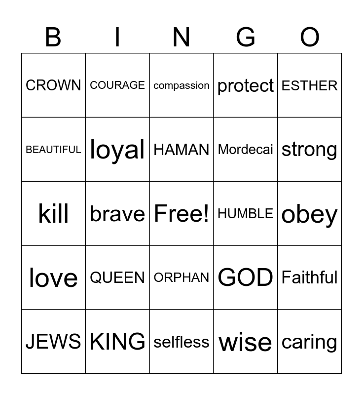 This bingo card has a free space and 24 words: QUEEN, KING, HAMAN, JEWS, ESTHER, CROWN, BEAUTIFUL, COURAGE, HUMBLE, ORPHAN, Mordecai, kill, GOD, Faithful, loyal, wise, obey, compassion, strong, brave, caring, love, protect and selfless.