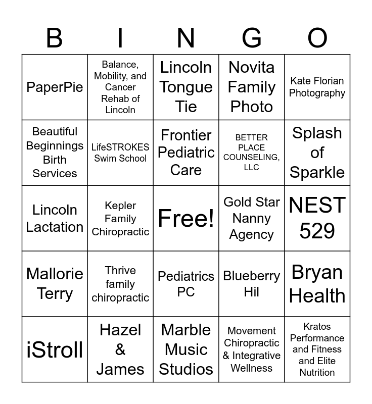 This bingo card has a free space and 42 words: Express Life Chiropractic, Frontier Pediatric Care, Connect Pediatric Therapy, Thrive family chiropractic, Movement Chiropractic & Integrative Wellness, Bryan Health, Kratos Performance and Fitness and Elite Nutrition, VICTRESS Lincoln, Lincoln Tongue Tie, Pediatrics PC, NEST 529, Splash of Sparkle, Kepler Family Chiropractic, Kate Florian Photography, Birthkept Doula Services, Blueberry Hil, Empower Physical Therapy, Lincoln Lactation, Gather & Grow Birth Services, Balance, Mobility, and Cancer Rehab of Lincoln, Beautiful Beginnings Birth Services, Lincoln Pediatric Dentistry, Inspire Occupational Therapy, PaperPie, The Little Hollow, Ball, Loudon, Ebert, & Brostrom, BETTER PLACE COUNSELING, LLC, Everything Zen Massage & Wellness, Past, Present & Forever, United Way of the Midlands, Oliver Acupuncture, Mallorie Terry, LifeSTROKES Swim School, Marble Music Studios, A Tee for Mom, iStroll, Hazel & James, Gold Star Nanny Agency, KidsPark, Connected4ever, Novita Family Photo and Rest+Nest Postpartum Doula.