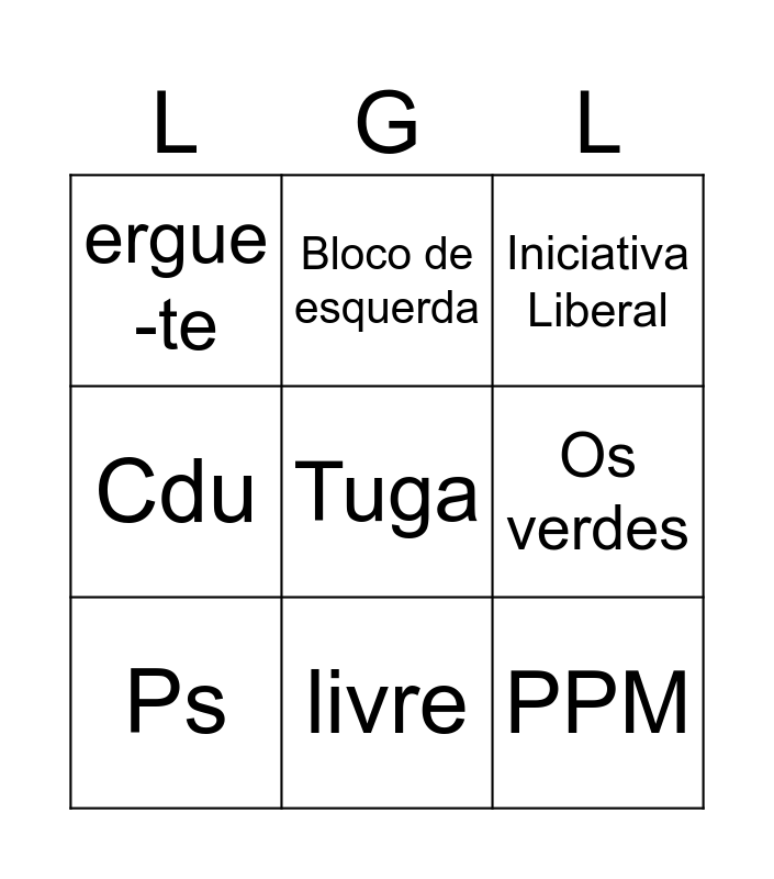 This bingo card has a free space and 14 words: Chega, PSD, Ps, Bloco de esquerda, Cdu, PPM, CDS, Pan, livre, ergue -te, Volt, Os verdes, Iniciativa Liberal and Mrpp.