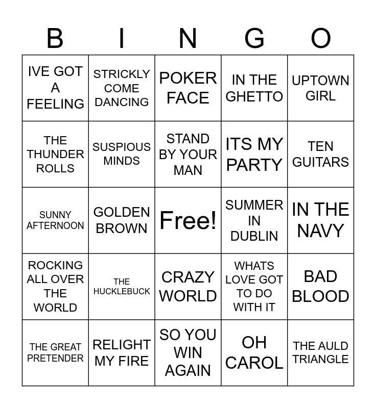 This bingo card has a free space and 44 words: THE IRISH ROVER, THE AULD TRIANGLE, WHEN IM 64, THE GREAT PRETENDER, ROCK AND ROLL MUSIC, OH CAROL, POKER FACE, SANDY, UPTOWN GIRL, RELIGHT MY FIRE, IN THE GHETTO, SUMMER IN DUBLIN, CRAZY WORLD, THE HUCKLEBUCK, THE GREEN DOOR, SO YOU WIN AGAIN, SWEET CHILD OF MINE, SUNNY AFTERNOON, SUGAR SUGAR, TEN GUITARS, STRICKLY COME DANCING, THATS THE WAY I LIKE IT, ROCK THE BOAT, IVE GOT A FEELING, SWEET DREAMS ARE MADE OF THIS, IN THE NAVY, YOURE A SUPERSTAR, MANIAC 2000, WHATS LOVE GOT TO DO WITH IT, ROCKING ALL OVER THE WORLD, TEENAGER IN LOVE, BAD BLOOD, CRUEL SUMMER, SHAKE IT OFF, GOLDEN BROWN, SHES A LADY, MAGGIE MAY, SPEEDY GONZALES, STAND BY YOUR MAN, THE THUNDER ROLLS, ITS MY PARTY, WAKE ME UP, SUSPIOUS MINDS and ROCKET MAN.