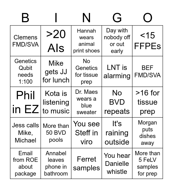 This bingo card has a free space and 24 words: More than 50 BVD pools, Annabel leaves phone in bathroom, No Genetics for tissue prep, Email from ROE about package, <15 FFPEs, Clemens FMD/SVA, Genetics Qubit needs 1:100, >20 AIs, No BVD repeats, You see Steff in viro, LNT is alarming, Phil in EZ, It's raining outside, Morgan puts dishes away, Mike gets JJ for lunch, You hear Danielle whistle, >16 for tissue prep, Hannah wears animal print shoes, BEF FMD/SVA, Kota is listening to music, More than 5 FeLV samples for prep, Jess calls Mike, Michael, Day with nobody off or out early and Ferret samples.