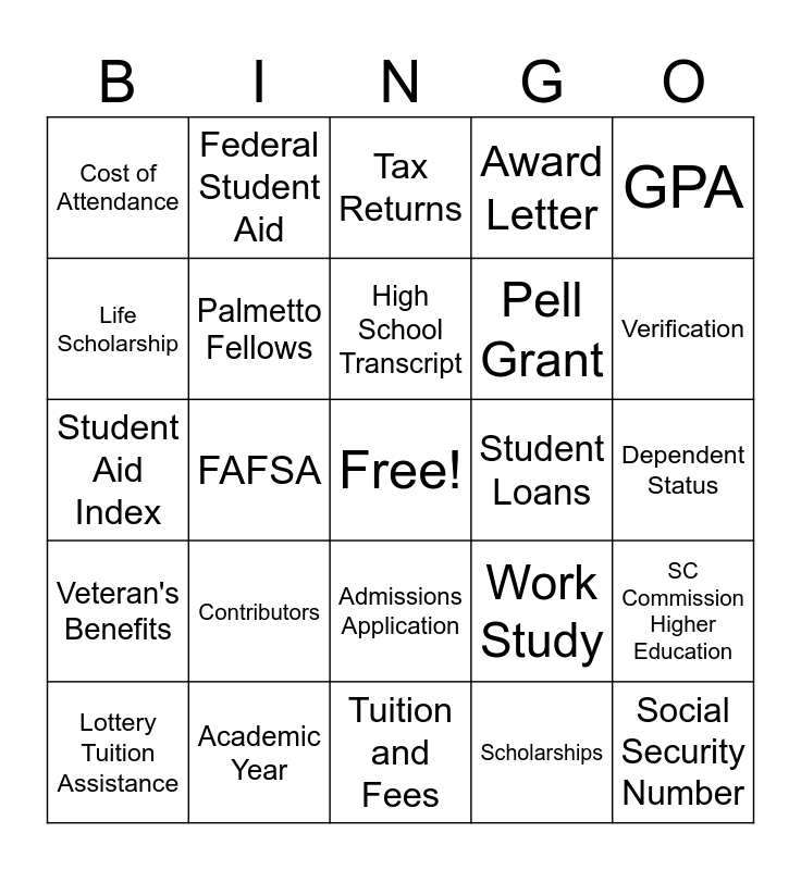 This bingo card has a free space and 24 words: Contributors, Academic Year, High School Transcript, Lottery Tuition Assistance, GPA, Cost of Attendance, Life Scholarship, Federal Student Aid, Student Loans, Admissions Application, Pell Grant, Student Aid Index, Work Study, SC Commission Higher Education, Palmetto Fellows, Scholarships, Dependent Status, Tax Returns, Verification, FAFSA, Social Security Number, Veteran's Benefits, Award Letter and Tuition and Fees.