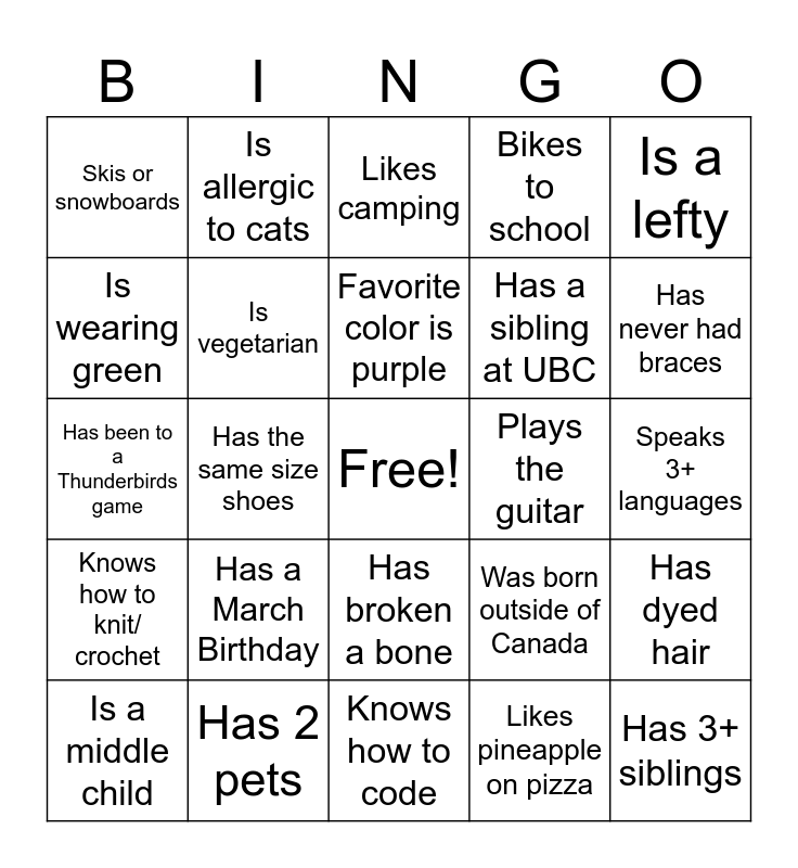 This bingo card has a free space and 24 words: Has a March Birthday, Has 2 pets, Favorite color is purple, Is a middle child, Is a lefty, Skis or snowboards, Is wearing green, Is allergic to cats, Plays the guitar, Has broken a bone, Has a sibling at UBC, Has been to a Thunderbirds game, Was born outside of Canada, Has dyed hair, Is vegetarian, Likes pineapple on pizza, Speaks 3+ languages, Likes camping, Has never had braces, Has the same size shoes, Has 3+ siblings, Knows how to knit/ crochet, Bikes to school and Knows how to code.