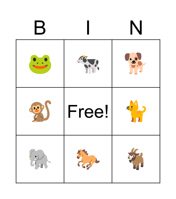 This bingo card has a free space and 8 words: 🐈, 🐕, 🐄, 🐘, 🐸, 🐐, 🐒 and 🐎.
