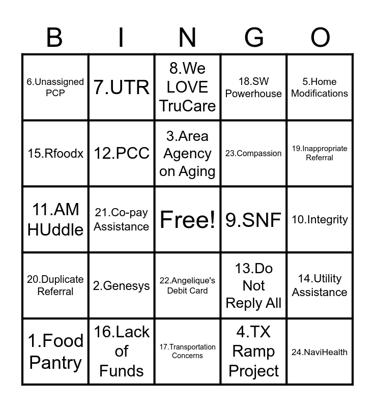 This bingo card has a free space and 24 words: 1.Food Pantry, 2.Genesys, 3.Area Agency on Aging, 4.TX Ramp Project, 5.Home Modifications, 6.Unassigned PCP, 7.UTR, 8.We LOVE TruCare, 9.SNF, 10.Integrity, 11.AM HUddle, 12.PCC, 13.Do Not Reply All, 14.Utility Assistance, 15.Rfoodx, 16.Lack of Funds, 17.Transportation Concerns, 18.SW Powerhouse, 19.Inappropriate Referral, 20.Duplicate Referral, 21.Co-pay Assistance, 22.Angelique's Debit Card, 23.Compassion and 24.NaviHealth.
