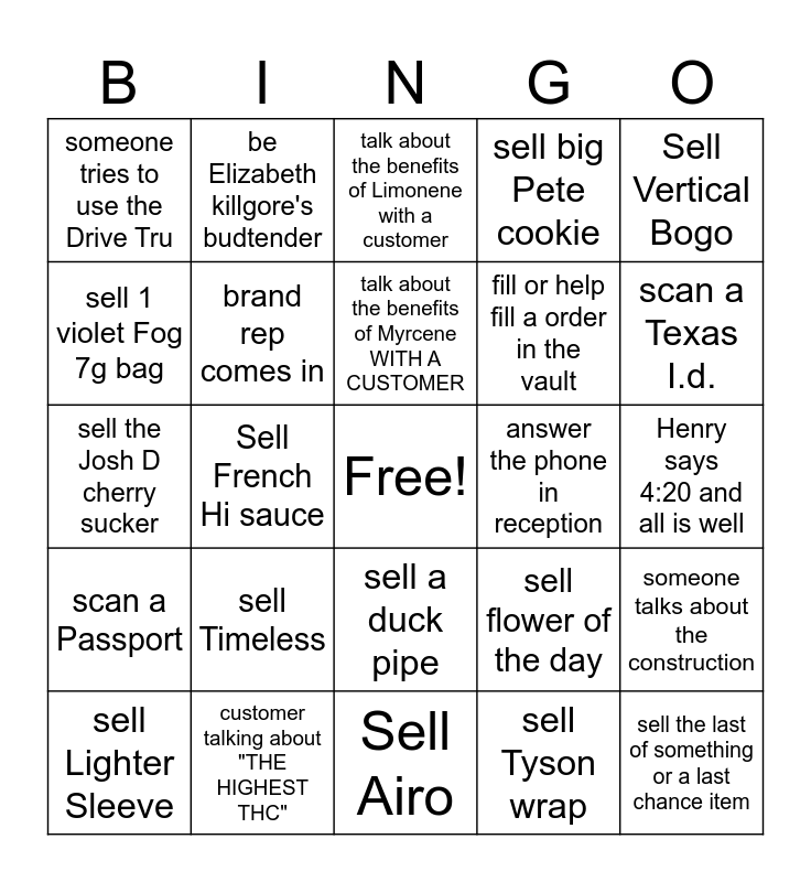 This bingo card has a free space and 24 words: sell Timeless, customer talking about "THE HIGHEST THC", talk about the benefits of Myrcene WITH A CUSTOMER, sell Lighter Sleeve, Sell Vertical Bogo, someone tries to use the Drive Tru, sell 1 violet Fog 7g bag, be Elizabeth killgore's budtender, answer the phone in reception, sell a duck pipe, fill or help fill a order in the vault, sell the Josh D cherry sucker, sell flower of the day, someone talks about the construction, brand rep comes in, sell Tyson wrap, Henry says 4:20 and all is well, talk about the benefits of Limonene with a customer, scan a Texas I.d., Sell French Hi sauce, sell the last of something or a last chance item, scan a Passport, sell big Pete cookie and Sell Airo.