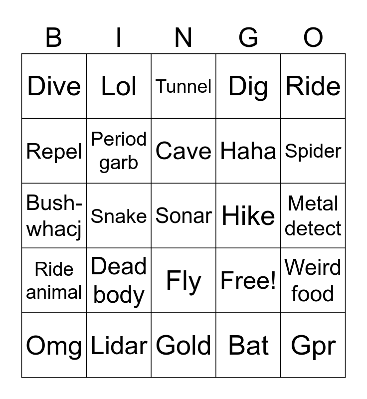 This bingo card has 25 words: Dead body, Gold, Cave, Omg, Ride, Dive, Repel, Lol, Hike, Fly, Haha, Bush-whacj, Free!, Weird food, Period garb, Gpr, Metal detect, Tunnel, Spider, Snake, Sonar, Lidar, Ride animal, Dig and Bat.