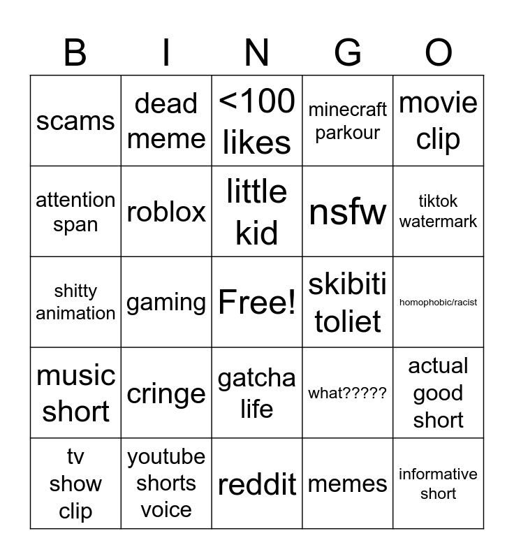 This bingo card has a free space and 24 words: cringe, youtube shorts voice, little kid, tv show clip, movie clip, scams, attention span, dead meme, skibiti toliet, gatcha life, nsfw, shitty animation, what?????, actual good short, roblox, memes, homophobic/racist, <100 likes, tiktok watermark, gaming, informative short, music short, minecraft parkour and reddit.