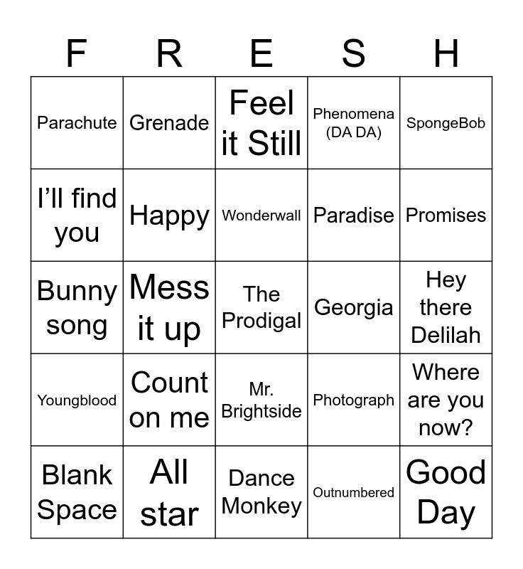 This bingo card has 28 words: Where are you now?, Saints, Paradise, Outnumbered, I’ll find you, Feel it Still, Grenade, Youngblood, Georgia, Blank Space, Bunny song, Phenomena (DA DA), All star, Dance Monkey, Promises, Praise on Praise, Count on me, Happy, Wonderwall, Mr. Brightside, Parachute, Good Day, The Prodigal, Mess it up, Hey there Delilah, Photograph, SpongeBob and Zeal.