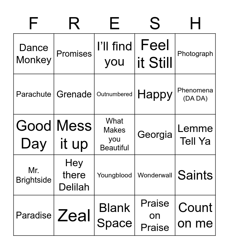 This bingo card has 30 words: Zeal, Where are you now?, Mess it up, Bunny song, Dance Monkey, I’ll find you, Grenade, Youngblood, Georgia, Blank Space, Lemme Tell Ya, What Makes you Beautiful, Praise on Praise, Count on me, Phenomena (DA DA), All star, Wonderwall, Mr. Brightside, Hey there Delilah, Photograph, Good Day, The Prodigal, Promises, Happy, Parachute, Feel it Still, Saints, Paradise, Outnumbered and SpongeBob.