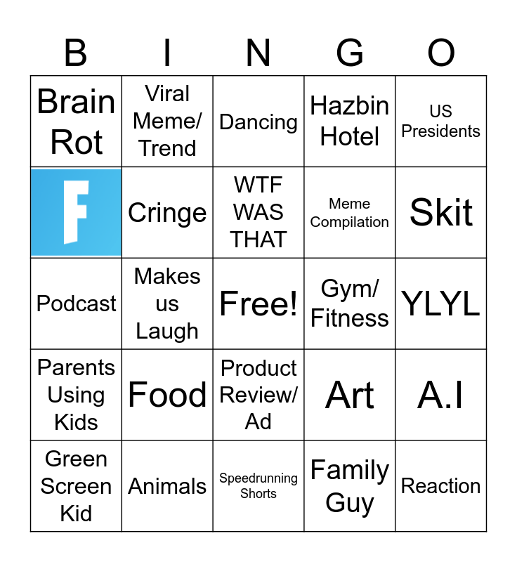 This bingo card has 3 images, a free space and 26 words: Green Screen Kid, Thirst Trap, Makes us Laugh, Brain Rot, Dancing, Cringe, Food, Gym/ Fitness, Animals, YLYL, Reaction, Speedrunning Shorts, Family Guy, Skit, Product Review/ Ad, Parents Using Kids, US Presidents, Podcast, Art, Clip from a full vid, Meme Compilation, Hazbin Hotel, Viral Meme/ Trend, A.I, WTF WAS THAT and Nintendo.
