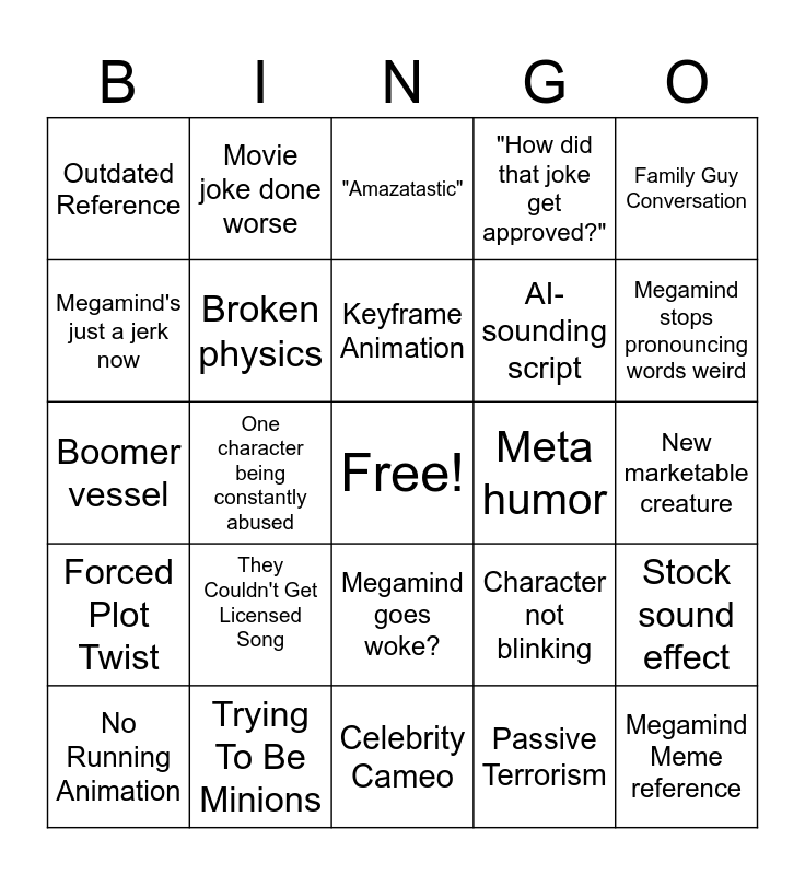 This bingo card has a free space and 24 words: They Couldn't Get Licensed Song, Trying To Be Minions, Keyframe Animation, No Running Animation, Family Guy Conversation, Outdated Reference, Megamind's just a jerk now, Movie joke done worse, Meta humor, Megamind goes woke?, AI-sounding script, Boomer vessel, Character not blinking, Stock sound effect, Broken physics, Passive Terrorism, New marketable creature, "Amazatastic", Megamind stops pronouncing words weird, One character being constantly abused, Megamind Meme reference, Forced Plot Twist, "How did that joke get approved?" and Celebrity Cameo.
