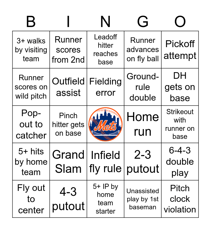This bingo card has a free space and 24 words: Grand Slam, 4-3 putout, Fielding error, Fly out to center, Pickoff attempt, 3+ walks by visiting team, Runner scores on wild pitch, Runner scores from 2nd, Home run, Infield fly rule, Ground-rule double, Pop-out to catcher, 2-3 putout, 6-4-3 double play, Outfield assist, Unassisted play by 1st baseman, Strikeout with runner on base, Leadoff hitter reaches base, DH gets on base, Pinch hitter gets on base, Pitch clock violation, 5+ hits by home team, Runner advances on fly ball and 5+ IP by home team starter.
