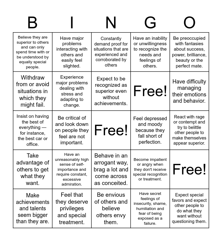 This bingo card has a free space and 24 words: Have an unreasonably high sense of self-importance and require constant, excessive admiration., Feel that they deserve privileges and special treatment., Expect to be recognized as superior even without achievements., Make achievements and talents seem bigger than they are., Be preoccupied with fantasies about success, power, brilliance, beauty or the perfect mate., Believe they are superior to others and can only spend time with or be understood by equally special people., Withdraw from or avoid situations in which they might fail., Have major problems interacting with others and easily feel slighted., Feel depressed and moody because they fall short of perfection., Behave in an arrogant way, brag a lot and come across as conceited., Free!, Insist on having the best of everything — for instance, the best car or office., Become impatient or angry when they don't receive special recognition or treatment., Free!, Experience major problems dealing with stress and adapting to change., Have secret feelings of insecurity, shame, humiliation and fear of being exposed as a failure., React with rage or contempt and try to belittle other people to make themselves appear superior., Constantly demand proof for situations that are experienced and corroborated by others, Have difficulty managing their emotions and behavior., Be critical of and look down on people they feel are not important., Expect special favors and expect other people to do what they want without questioning them., Take advantage of others to get what they want., Have an inability or unwillingness to recognize the needs and feelings of others. and Be envious of others and believe others envy them..