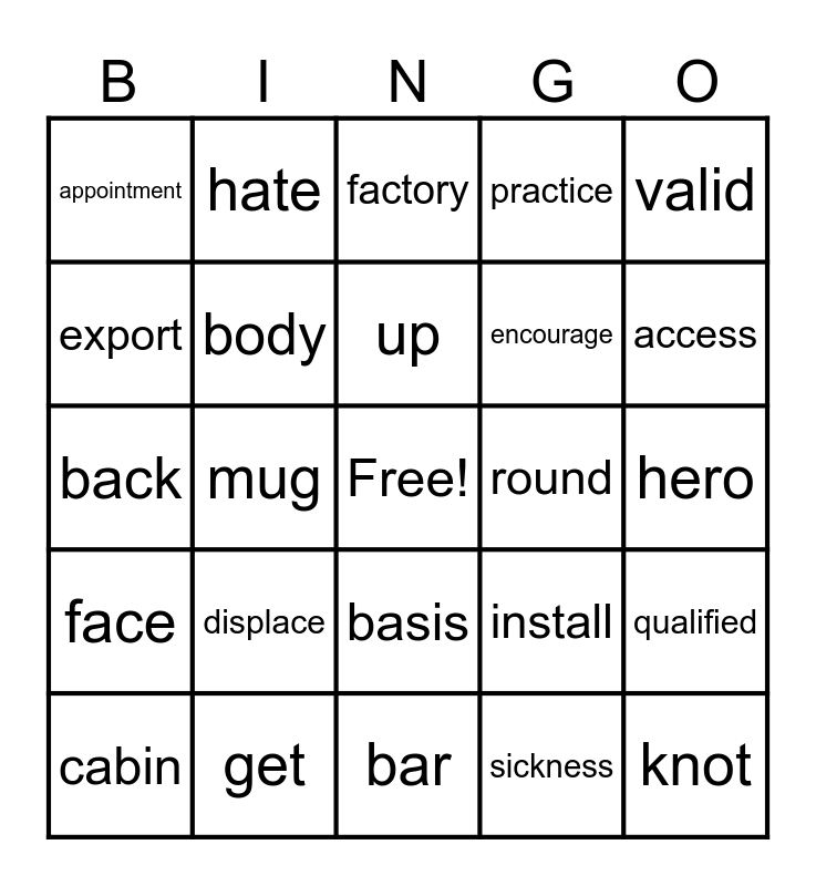 This bingo card has a free space and 50 words: paradox, get, smell, prestige, hero, workshop, hate, mill, encourage, crash, appointment, body, bar, sickness, enfix, cry, mug, up, coincidence, valid, back, weak, factory, round, glow, face, displace, trainer, practice, qualified, pressure, world, quarrel, insist, culture, cabin, market, project, value, access, soup, opinion, basis, ethics, knot, export, lump, humanity, install and charity.