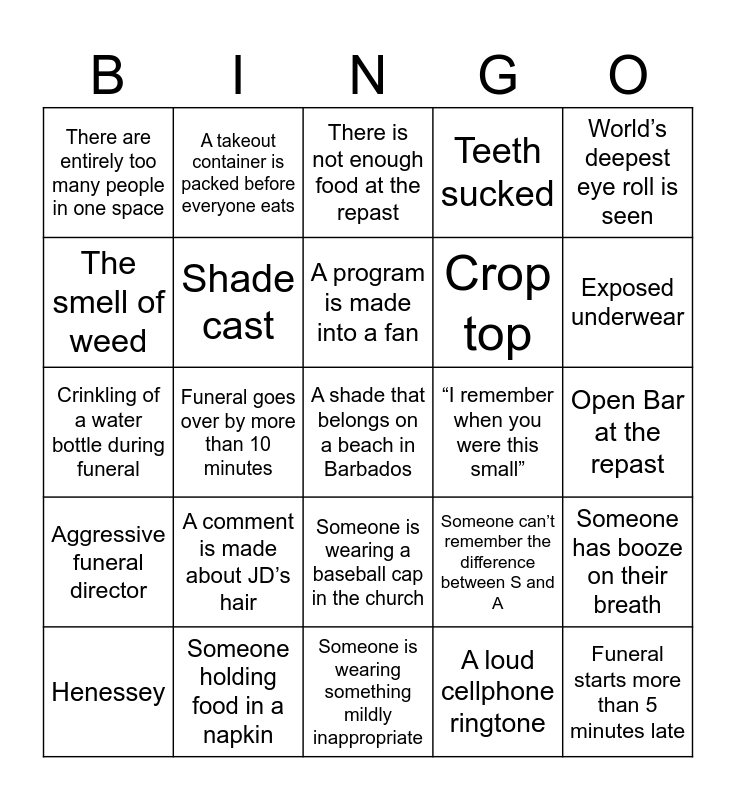 This bingo card has a free space and 48 words: Someone mentions they weren’t invited to the wedding, Funeral starts more than 5 minutes late, Someone is wearing jeans (other than black), Someone is wearing something mildly inappropriate, A comment is made about JD’s hair, There is mention of money loaned or not given, A takeout container is packed before everyone eats, Someone can’t remember the difference between N and E, The smell of weed, Something only a pimp could wear appears, Shade cast, Teeth sucked, Someone has booze on their breath, Someone can’t remember the difference between S and A, Body thrown on casket sobbing, The pastor/priest speaks for more than 15 minutes, A program is made into a fan, “I remember when you were this small”, Grandma Urla refers to Raul as her friend, World’s deepest eye roll is seen, Funeral goes over by more than 10 minutes, A loud cellphone ringtone, There are entirely too many people in one space, Crop top, Black Air Force Ones, Exposed underwear, Henessey, Jogger or sweatpants, Someone is wearing a baseball cap in the church, Aggressive funeral director, Beanies in the church, Crocs are worn, Ratchet music at the repast, Balloons at the repast, Someone holding food in a napkin, A physical or verbal altercation, Bad singing, Open Bar at the repast, Grandma Miller makes a comment about dying, A loose child running around unattended, New family member appears!, Someone is wearing white, There is not enough food at the repast, Someone dabs their eyes with an actual handkerchief, Crinkling of a water bottle during funeral, Glitter, A large church hat and Eyes wide from the audacity.