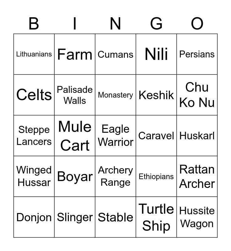 This bingo card has 163 words: Armenians, Aztecs, Bengalis, Berbers, Bohemians, Britons, Bulgarians, Burgundians, Burmese, Byzantines, Celts, Chinese, Cumans, Dravidians, Ethiopians, Franks, Georgians, Goths, Gurjaras, Hindustanis, Huns, Incas, Italians, Japanese, Khmer, Koreans, Lithuanians, Magyars, Malay, Malians, Mayans, Mongols, Persians, Poles, Portuguese, Romans, Saracens, Sicilians, Slavs, Spanish, Tatars, Teutons, Turks, Vietnamese, Vikings, Huskarl, Samurai, Mangudai, War Elephant, Mameluke, Teutonic Knight, Janissary, Berserk, Longboat, Jaguar Warrior, Tarkan, War Wagon, Turtle Ship, Plumed Archer, Conquistador, Missionary, Kamayuk, Slinger, Genoese Crossbowman, Condottiero, Magyar Huszar, Boyar, Camel Archer, Genitour, Shotel Warrior, Gbeto, Organ Gun, Caravel, Arambai, Ballista Elephant, Karambit Warrior, Rattan Archer, Imperial Skirmisher, Konnik, Kipchak, Leitis, Keshik, Flaming Camel, Coustillier, Flemish Militia, Serjeant, Hussite Wagon, Houfnice, Winged Hussar, Obuch, Ratha, Urumi Swordsman, Thirisadai, Chakram Thrower, Shrivamsha Rider, Camel Scout, Ghulam, Imperial Camel Rider, Legionary, Centurian, Monaspa, Composite Bowman, Warrior Priest, Savar, Elephant Archer, Eagle Warrior, Winged Hussar, Steppe Lancers, Xolotl Warrior, Armored Elephant, Dromon, Battle Elephant, Longbowman, Cataphract, Woad Raider, Chu Ko Nu, Throwing Axeman, Barracks, Archery Range, Stable, Siege Workshop, Blacksmith, Dock, Fish Trap, Harbor, University, Outpost, Palisade Walls, Palisade Gate, Stone Wall, Gate, Tower-Line, Bombard Tower, Castle, Krepost, Donjon, Monastery, Fortified Church, House, Town Center, Wonder, Feitoria, Caravanserai, Mining Camp, Mule Cart, Lumber Camp, Mill, Folwark, Market, Farm, T90, Memb, Viper, Hera, Nili, Ornlu, Doubt, Spirit of the Law, Tatoh, Lierry, Dave, JorDan and Mr. Yo.