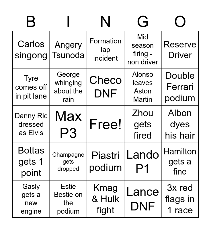 This bingo card has a free space and 24 words: Champagne gets dropped, Estie Bestie on the podium, Checo DNF, Gasly gets a new engine, Reserve Driver, Carlos singong, Tyre comes off in pit lane, Angery Tsunoda, Zhou gets fired, Piastri podium, Alonso leaves Aston Martin, Danny Ric dressed as Elvis, Lando P1, Hamilton gets a fine, George whinging about the rain, Lance DNF, Albon dyes his hair, Formation lap incident, Double Ferrari podium, Max P3, 3x red flags in 1 race, Bottas gets 1 point, Mid season firing - non driver and Kmag & Hulk fight.