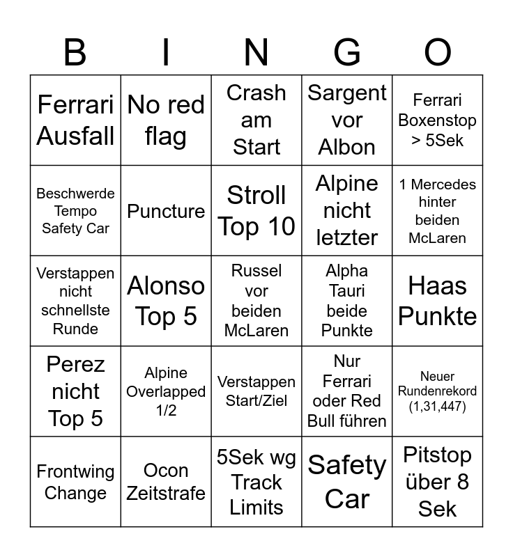 This bingo card has 25 words: Alpine Overlapped 1/2, 5Sek wg Track Limits, Stroll Top 10, Frontwing Change, Ferrari Boxenstop > 5Sek, Ferrari Ausfall, Beschwerde Tempo Safety Car, No red flag, Alpha Tauri beide Punkte, Verstappen Start/Ziel, Alpine nicht letzter, Verstappen nicht schnellste Runde, Nur Ferrari oder Red Bull führen, Neuer Rundenrekord (1,31,447), Puncture, Pitstop über 8 Sek, Haas Punkte, Crash am Start, 1 Mercedes hinter beiden McLaren, Alonso Top 5, Russel vor beiden McLaren, Ocon Zeitstrafe, Perez nicht Top 5, Sargent vor Albon and Safety Car.