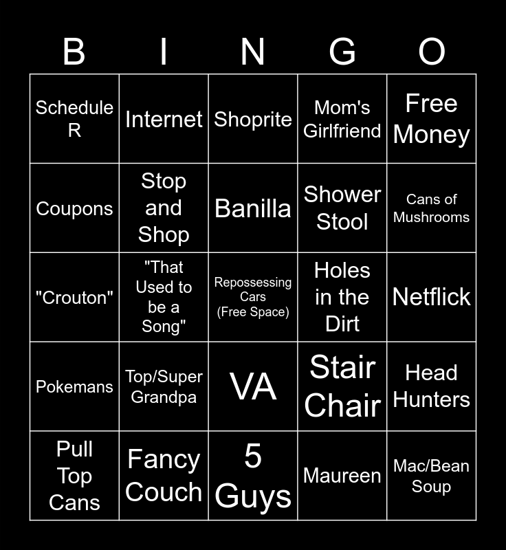 This bingo card has a free space and 91 words: Crosswords, Sleeping Outside, VA, Laundry, Favorite Grandson, Wheel of Fortune, "We'll keep __ here for a while", Horizon, Party, "I got your bag of candy", Jeopardy, Pasghetti, GM, Netflick, Once per week phone call, Banilla, Jewish Deli, Optima, "You too", The Warden, Sour Patch Kids, Any Neighbor, 5 Guys, Donuts, "Crouton", Fancy Couch, One of Bill's friends, Taco Bill, "Nothing is on right now", Patrice, James, Head Hunters, Fonzie, Pokemans, Schedule R, Mom's Girlfriend, Shoprite, Donuts, "That Used to be a Song", Cans of Mushrooms, Pull Top Cans, Coupons, Powerball, Scat Bus, Driveway, Stair Chair, SYN, Married W/ Children, Snapple, Any New Girlfriends?, Fairfield, Shower Stool, Needles, Medicine, Combos, Kid's Outside, Holes in the Dirt, Coffee, Rite Aid, Gunsmoke, Western Channel, Logo Channel, M*A*S*H, Yogi, Low Toilet, Hot/Cold Swapped, Gene, Maureen, Revolving Door, Paper Bag, Top/Super Grandpa, Mac/Bean Soup, M.O.D., The Bank, Internet, Stop and Shop, Mets, Rangers, Voicemail, Morning phone call, Rain, Free Money, Saturday Morning, Michelle, Job, Lifeguard, Fast food, Any absurdly low cost, Fruit Punch, Pinky and Roundbottom Bob.