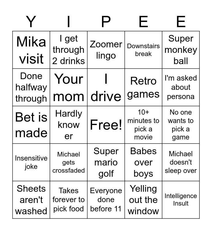 This bingo card has a free space and 24 words: Michael gets crossfaded, Takes forever to pick food, I drive, Sheets aren't washed, Super monkey ball, Mika visit, Done halfway through, I get through 2 drinks, 10+ minutes to pick a movie, Super mario golf, Retro games, Bet is made, Babes over boys, Michael doesn't sleep over, Your mom, Yelling out the window, No one wants to pick a game, Zoomer lingo, I'm asked about persona, Hardly know er, Intelligence Insult, Insensitive joke, Downstairs break and Everyone done before 11.