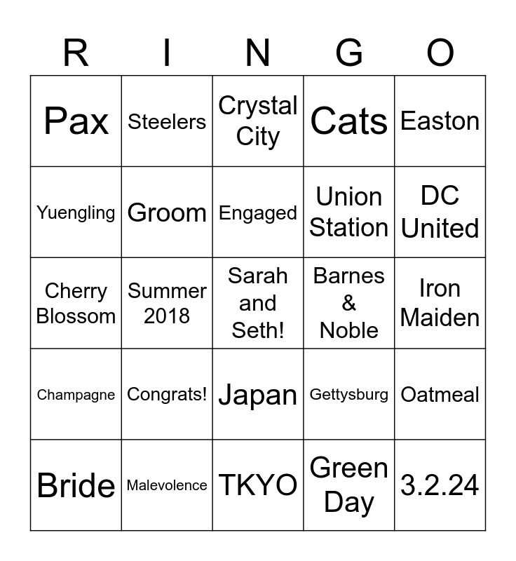 This bingo card has a free space and 29 words: Bride, Fiancé, Summer 2018, Ring, Pax, Crystal City, Groom, Congrats!, Barnes & Noble, Malevolence, Iron Maiden, 3.2.24, TKYO, Green Day, DC United, PA, Japan, Champagne, Easton, Cherry Blossom, Gettysburg, College Hill Tavern, Union Station, Yuengling, Cats, Steelers, Oatmeal, Engaged and Wedding.