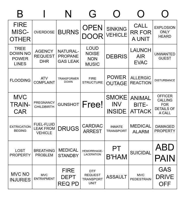 This bingo card has a free space and 48 words: PT B'HAM, LAUNCH AIR EVAC, DTF REQUEST TRANSPORT UNIT, PREGNANCY CHILDBIRTH, TRANSFORMER DOWN, OFFICER CALLING FOR DETAILS OF A CALL, OVERDOSE, MVC ENTRAPMENT, CALL RR FOR A UNIT, CARDIAC ARREST, EXPLOSION ONLY HEARD, OPEN DOOR, ALLERGIC REACTION, POWER OUTAGE, LOST PROPERTY, ANIMAL BITE-ATTACK, TREE DOWN NO POWER LINES, UNWANTED GUEST, SUICIDAL, SINKING VEHICLE, DEBRIS, GUNSHOT, FIRE MISC-OTHER, AGENCY REQUEST DHR, ABD PAIN, NATURAL-PROPANE GAS LEAK, DISTURBANCE, MVC NO INJURIES, FIRE STRUCTURE, ATV COMPLAINT, MVC PEDESTRAIN, SMOKE INV INSIDE, DAMAGED PROPERTY, BREATHING PROBLEM, MVC TRAIN-CAR, INMATE TRANSPORT, MEDICAL ALARM, FLOODING, DRUGS, MEDICAL STANDBY, EXTRICATION BEGING, GAS DRIVE OFF, BURNS, FIRE DEPT REQ PD, LOUD NOISE NON MUSIC, HEMORRHAGE-LACERATION, FUEL-FLUID LEAK FROM VEHICLE and ASSAULT.