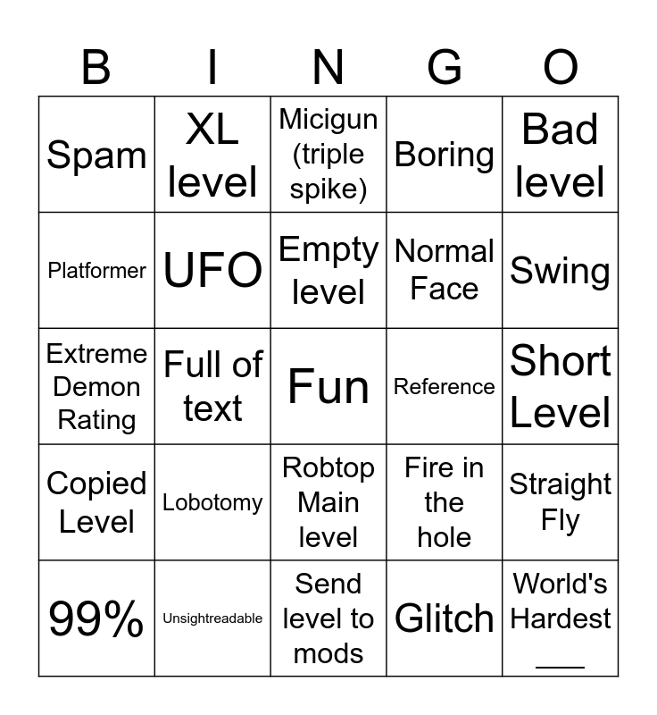 This bingo card has 25 words: Lobotomy, Send level to mods, Empty level, 99%, Bad level, Spam, Platformer, XL level, Reference, Robtop Main level, Normal Face, Extreme Demon Rating, Fire in the hole, Straight Fly, UFO, World's Hardest ___, Short Level, Micigun (triple spike), Swing, Full of text, Fun, Unsightreadable, Copied Level, Boring and Glitch.