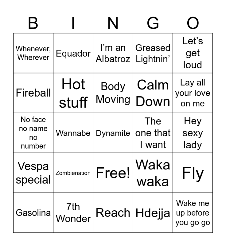 This bingo card has 85 words: 7 seconds, Queen of kings, I’m an Albatroz, Balada, Narco, Brazil, Prada, Desire, Destination Calabria, Dragostea Din Tei, Blue, Euphoria, Free!, Calm Down, Sa l-ahhar nifs, Whenever, Wherever, Wannabe, Dynamite, Hafi paci kuluri, Wake me up before you go go, Poker face, Hot stuff, Reach, Gimme dat banana, Lay all your love on me, Voulez Vous, Regina, Barbie Girl, Time of my life, Don’t stop movin, Gasolina, Another summer night, Gimme Gimme Gimme, Greased Lightnin’, Hey sexy lady, I want to break free, 7th Wonder, Savage love, The one that I want, Let’s get loud, Mambo no 5, Beggin, Flowers, Moves like jagger, Fly, Broomstick, Infinity, It goes like nanana, La Bomba, Magic in the air, Fireball, Equador, Die Immer Lacht, Follow the Leader, Tkellimni Xejn, Voglio Vederti Danzare, Zombienation, Body Moving, Hdejja, The best, We are the champions, Fjura fil-kantina, Xemx, Xemx u xita, On again off again, No face no name no number, Daddy cool, Blue suede shoes, La camisa Negra, Sara perche ti amo, Like a prayer, La isla bonita, Cotton eyed joe, I am the music man, Set fire to the rain, Marry you, Three little birds, DJ got us fallen in love, Sweet melody, Tal-haxix jaghjjat, Vespa special, Made you look, One kiss, Waka waka and Valerie.