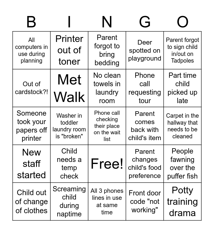 This bingo card has 45 words: All 3 bathrooms in use during your 10, Phone call checking their place on the wait list, Camper missed the field trip bus, Child out of change of clothes, IT issue, Front door code "not working", Parent forgot to bring bedding, No chairs available in staff room, Parent forgot to sign child in/out on Tadpoles, Screaming child during naptime, Deer spotted on playground, Parent comes back with child's item, Free!, Child needs a temp check, Staff calling out last minute, All 3 phones lines in use at same time, Phone call but no one's on the line, Someone took your papers off printer, Teacher gets locked out of Tadpoles on iPad, Part time child picked up late, Printer out of toner, Mystery fluids on bathroom floor, Float staff unscheduled or gap in schedule, All computers in use during planning, Parent phone call to check on child during the day, Carpet in the hallway that needs to be cleaned, Laundry room key misplaced, Child hugs Sammy on way out, Parent changes child's food preference, New staff started, Breaker lists got mixed up, People fawning over the puffer fish, Child hugs Sammy on way in, Someone asks if puffer fish is gone, Dead animal on playground, Washer in toddler laundry room is "broken", Child doesn't want to get up from nap, Staff requests to leave early, Potty training drama, No clean towels in laundry room, Out of cardstock?!, Phone call requesting tour, No parking spots left, Met Walk and iPad charger missing or broken.