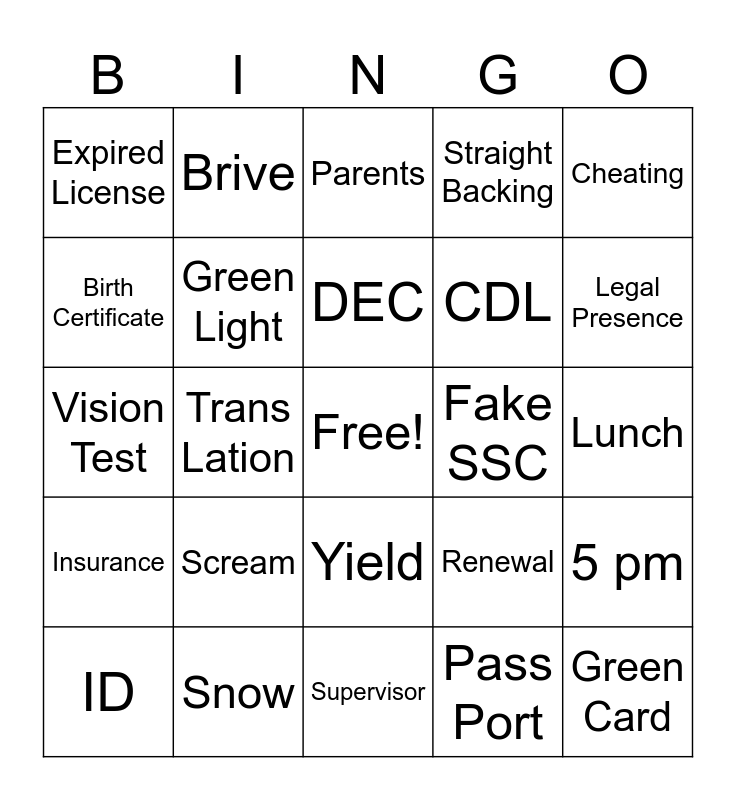 This bingo card has 1 images, a free space and 34 words: Complet Stop, Red Light, Railroad Crossing, Green Light, Yield, Straight Backing, Birth Certificate, Test, DEC, Road Test, Vision Test, Cheating, No Cell Phones, 3 Pt Turn, Expired License, Fake SSC, Pass Port, Trans Lation, Insurance, Green Card, Renewal, ID, 5 pm, Snow, Parents, Legal Presence, SHP, Eligibility Certificate, CDL, Lunch, Overtime, Supervisor, Scream and Brive.