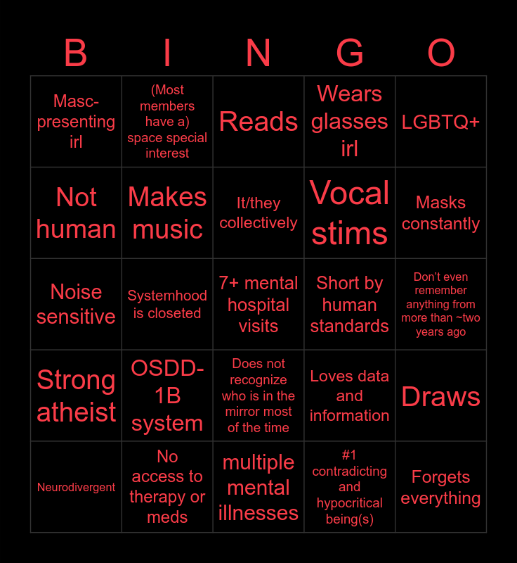 This bingo card has 25 words: OSDD-1B system, multiple mental illnesses, It/they collectively, Neurodivergent, LGBTQ+, Masc-presenting irl, Not human, (Most members have a) space special interest, Short by human standards, Does not recognize who is in the mirror most of the time, Vocal stims, Noise sensitive, Loves data and information, Draws, Makes music, Forgets everything, Don’t even remember anything from more than ~two years ago, Reads, Masks constantly, Systemhood is closeted, 7+ mental hospital visits, No access to therapy or meds, Strong atheist, Wears glasses irl and #1 contradicting and hypocritical being(s).