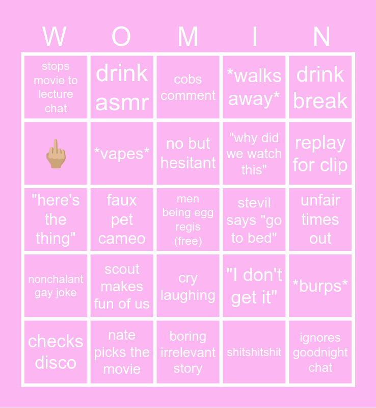This bingo card has a free space and 24 words: scout makes fun of us, nate picks the movie, no but hesitant, checks disco, drink break, stops movie to lecture chat, 🖕🏼, drink asmr, stevil says "go to bed", cry laughing, "why did we watch this", "here's the thing", "I don't get it", *burps*, *vapes*, shitshitshit, unfair times out, cobs comment, replay for clip, faux pet cameo, ignores goodnight chat, nonchalant gay joke, *walks away* and boring irrelevant story.
