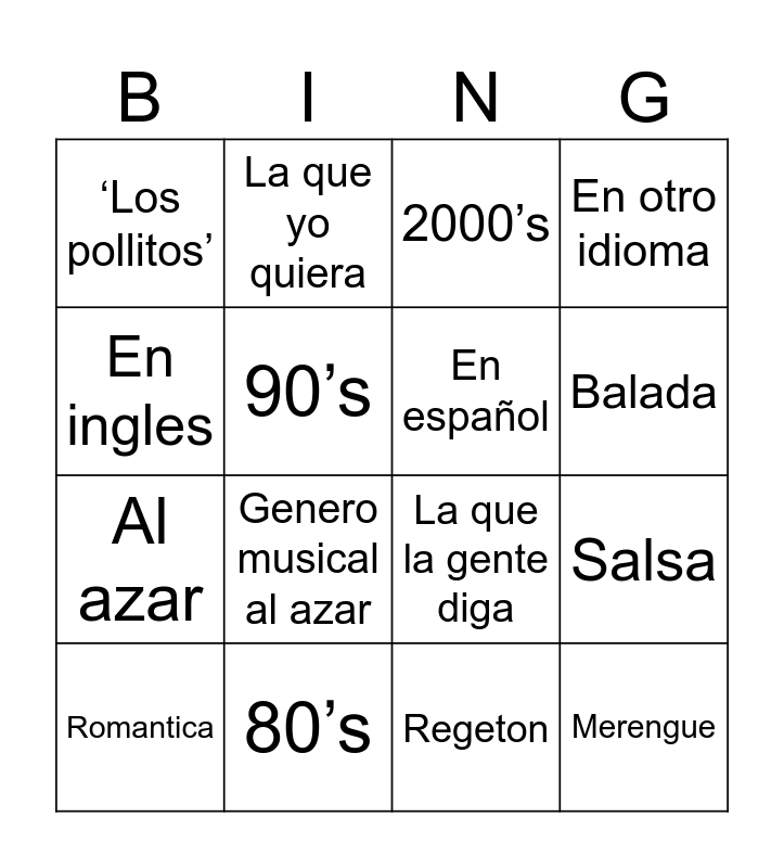 This bingo card has 16 words: 80’s, Salsa, 2000’s, ‘Los pollitos’, Al azar, La que yo quiera, La que la gente diga, Regeton, En ingles, 90’s, Romantica, En otro idioma, Genero musical al azar, Balada, En español and Merengue.