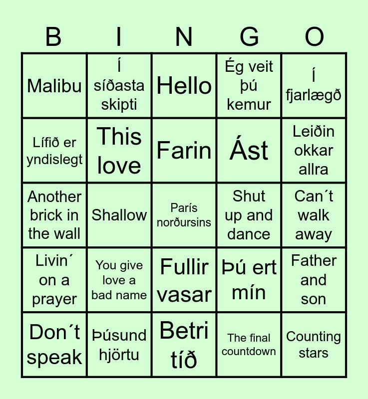 This bingo card has 75 words: Krókurinn, Allt eða ekkert, Farin, Cuanto le gusta, Ég er ennþá þessi asni sem þú kysstir þá, Mýrdalssandur, Það er gott að elska, Maður með mönnum, Ef ég væri Guð, Stúlkan, Malbik, Sorry mamma, Fullir vasar, Ást, Sól um nótt, Lífið er yndislegt, Þúsund hjörtu, Betri tíð, Bleikur og blár, Leiðin okkar allra, Nýjan stað, Í síðasta skipti, París norðursins, Ég veit þú kemur, Í fjarlægð, Draumur um Nínu, Álfheiður Björk, Ég verð að komast aftur heim, All out of luck, Is it true, Parísarhjól, Rómeó og Júlía, Í larí lei, Þú ert mín, Can´t walk away, Malibu, Price tag, Take me to church, Shut up and dance, Counting stars, Perfect, Try, Hold my hand, Blurred lines, Chandelier, Diamonds, Shallow, Hello, All of me, Dear future husband, I kissed a girl, This love, Lady marmalade, One, It must have been love, Losing my religion, More than words, Shape of my heart, Breakfast at Tiffany´s, Pump up the jam, Don´t speak, What´s up?, It´s my life, Wannabe, Man! I feel like a woman, Another brick in the wall, Knockin´ on heaven´s door, Listen to the music, Your song, Father and son, Livin´ on a prayer, You give love a bad name, Paradise city, The final countdown and Another one bites the dust.