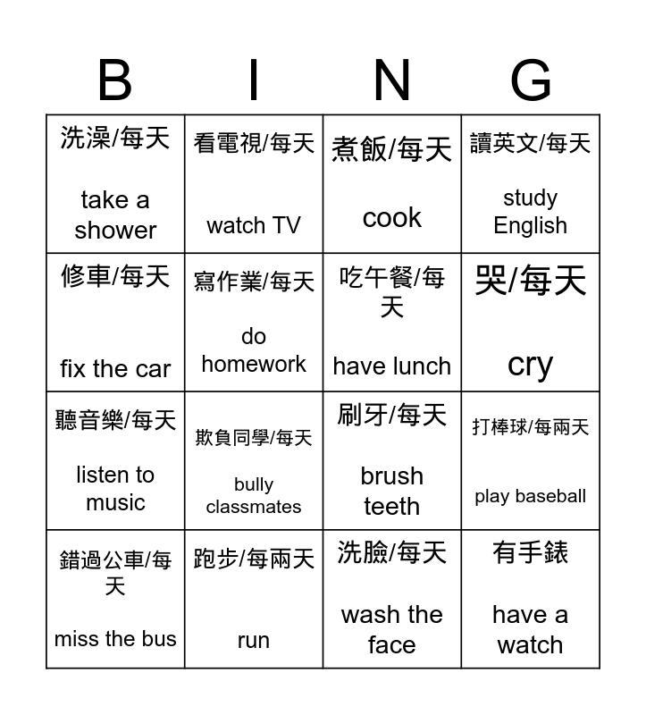 This bingo card has 16 words: 跑步/每兩天 run, 打棒球/每兩天 play baseball, 煮飯/每天 cook, 洗澡/每天 take a shower, 聽音樂/每天 listen to music, 看電視/每天 watch TV, 刷牙/每天 brush teeth, 洗臉/每天 wash the face, 修車/每天 fix the car, 寫作業/每天 do homework, 錯過公車/每天 miss the bus, 讀英文/每天 study English, 欺負同學/每天 bully classmates, 哭/每天 cry, 吃午餐/每天 have lunch and 有手錶 have a watch.