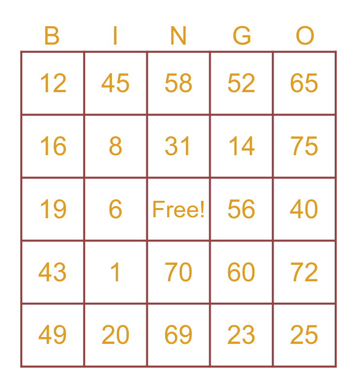 This bingo card has a free space and 24 words: 1, 20, 31, 49, 65, 12, 16, 45, 56, 70, 14, 19, 60, 72, 8, 23, 40, 58, 75, 6, 25, 43, 52 and 69.
