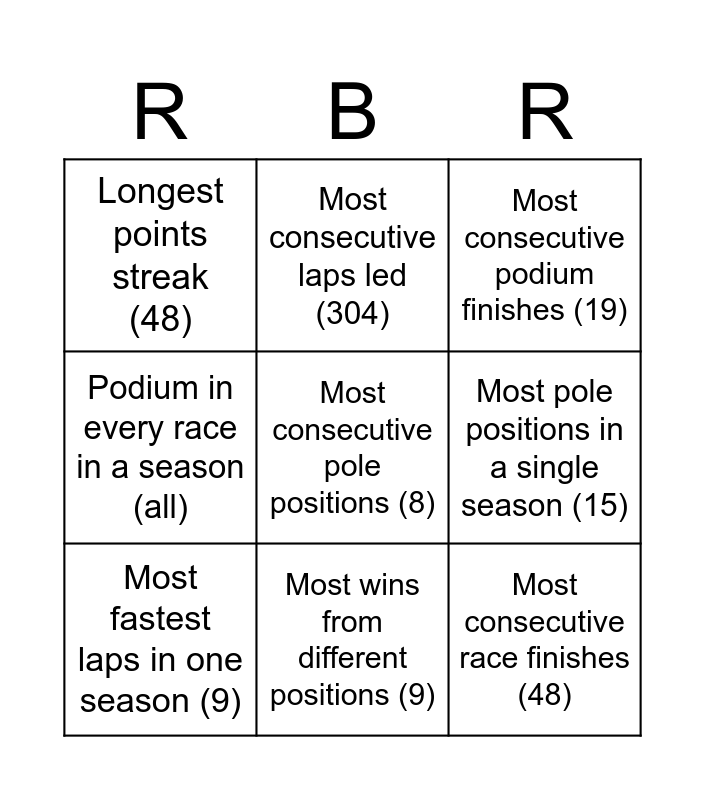 This bingo card has a free space and 8 words: Most pole positions in a single season (15), Most consecutive podium finishes (19), Most consecutive laps led (304), Most fastest laps in one season (9), Longest points streak (48), Most consecutive race finishes (48), Podium in every race in a season (all) and Most wins from different positions (9).