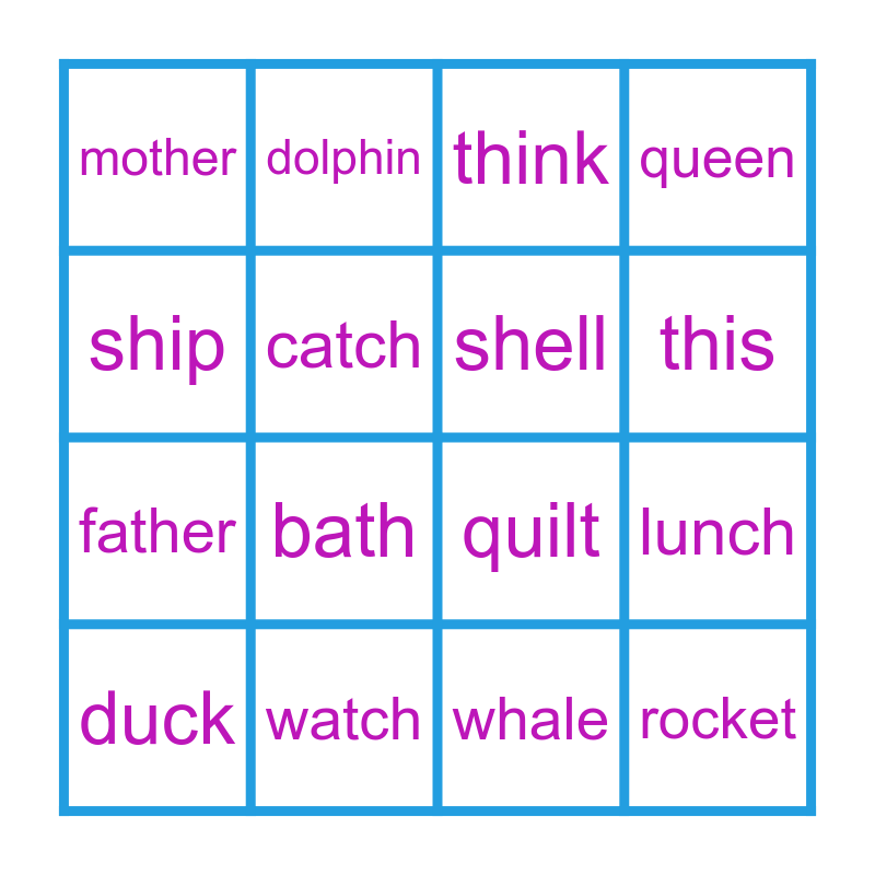 This bingo card has 25 words: Good luck!, chick, this, white, ship, mother, catch, dolphin, watch, that, father, quilt, phone, three, shell, teeth, whale, think, bath, lunch, duck, fish, rocket, queen and brush.