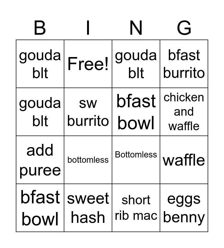 This bingo card has 19 words: Bottomless, sweet hash, gouda blt, eggs benny, waffle, gouda blt, short rib mac, gouda blt, Free!, add puree, bottomless, sw burrito, bfast bowl, sweet hash, bfast bowl, eggs benny, bfast burrito, chicken and waffle and mimosa.