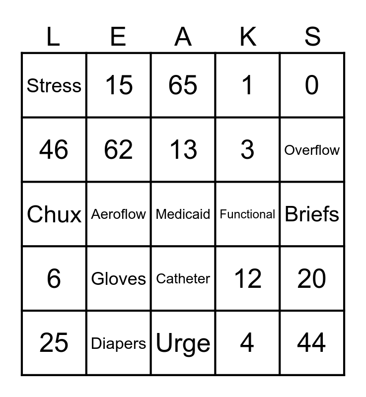 This bingo card has a free space and 24 words: 25, Gloves, 13, 4, 0, Stress, 15, 65, Functional, Briefs, Chux, 62, 12, 20, 46, Diapers, Urge, 1, Overflow, 6, Aeroflow, Catheter, 3 and 44.