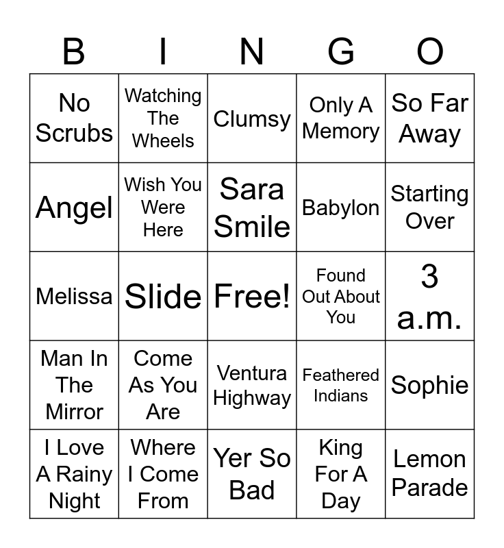 This bingo card has a free space and 40 words: Lonely Old Night, Melissa, T.N.T., Wish You Were Here, Where I Come From, Ventura Highway, Sara Smile, Every Rose Has I’ts Thorn, So Far Away, Man In The Mirror, Slide, Only A Memory, Lemon Parade, 3 a.m., Found Out About You, Come As You Are, Little Black Backpack, No Scrubs, Runaway Train, Clumsy, Sophie, King For A Day, Babylon, Angel, The Middle, Counting Stars, Let Her Go, Amazed, Dead Flowers, Toes, Rhinestone Cowboy, I Love A Rainy Night, People Are Crazy, Feathered Indians, Starting Over, Yer So Bad, When I’m 64, While My Guitar Gently Weeps, Watching The Wheels and Let Him In.