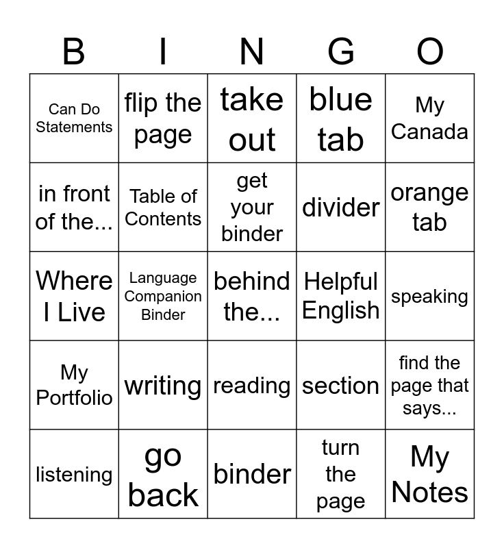 This bingo card has 29 words: listening, open to page..., Language Companion Binder, My Notes, Can Do Statements, take out, Table of Contents, writing, Helpful English, go back, speaking, behind the..., binder, turn the page, orange tab, put in, reading, My Portfolio, My Canada, Where I Live, section, go forward, divider, in front of the..., blue tab, flip the page, find the page that says..., get your binder and put your binder away.