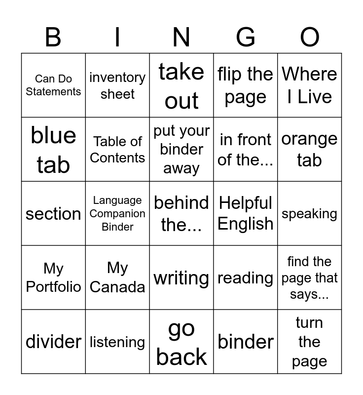 This bingo card has 30 words: listening, open to page..., Language Companion Binder, My Notes, Can Do Statements, take out, Table of Contents, writing, Helpful English, go back, speaking, behind the..., binder, turn the page, orange tab, put in, reading, My Portfolio, My Canada, Where I Live, section, go forward, inventory sheet, in front of the..., blue tab, flip the page, find the page that says..., divider, put your binder away and assessment.