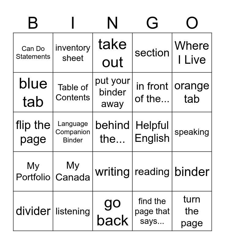 This bingo card has 30 words: listening, open to page..., Language Companion Binder, My Notes, Can Do Statements, take out, Table of Contents, writing, Helpful English, go back, speaking, behind the..., find the page that says..., turn the page, orange tab, put in, reading, My Portfolio, My Canada, Where I Live, flip the page, go forward, inventory sheet, in front of the..., blue tab, section, binder, divider, put your binder away and assessment.
